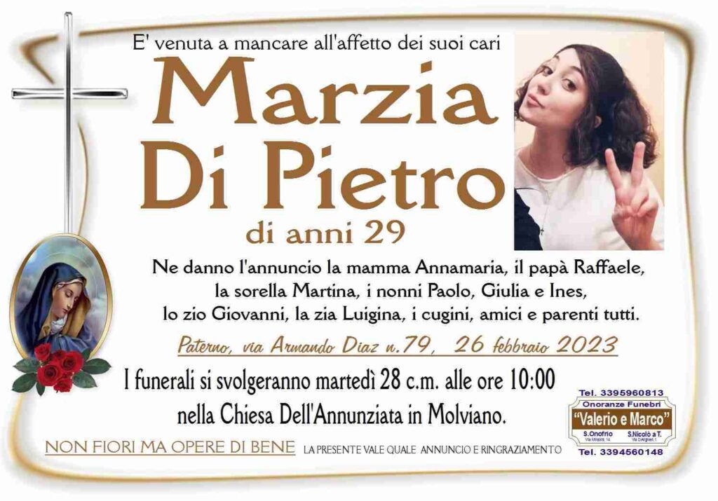 I funerali di Marzia si svolgeranno martedì mattina alle 10 nella chiesa dell’Annunziata in Molviano a Campli. La sua morte è una grande perdita per la comunità di Teramo e per tutti coloro che l’hanno conosciuta e apprezzata per il suo lavoro e la sua personalità.