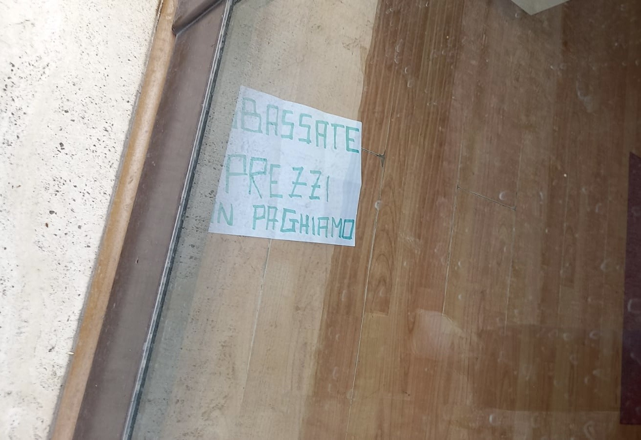 E’ stata incollata la porta di ingresso con silicone e colla, inoltre è stato trovato un biglietto contenente la frase “abbassate i prezzi non paghiamo” scritta con un pennarello verde all’interno del negozio dell’imprenditore Paolo Brizzi.