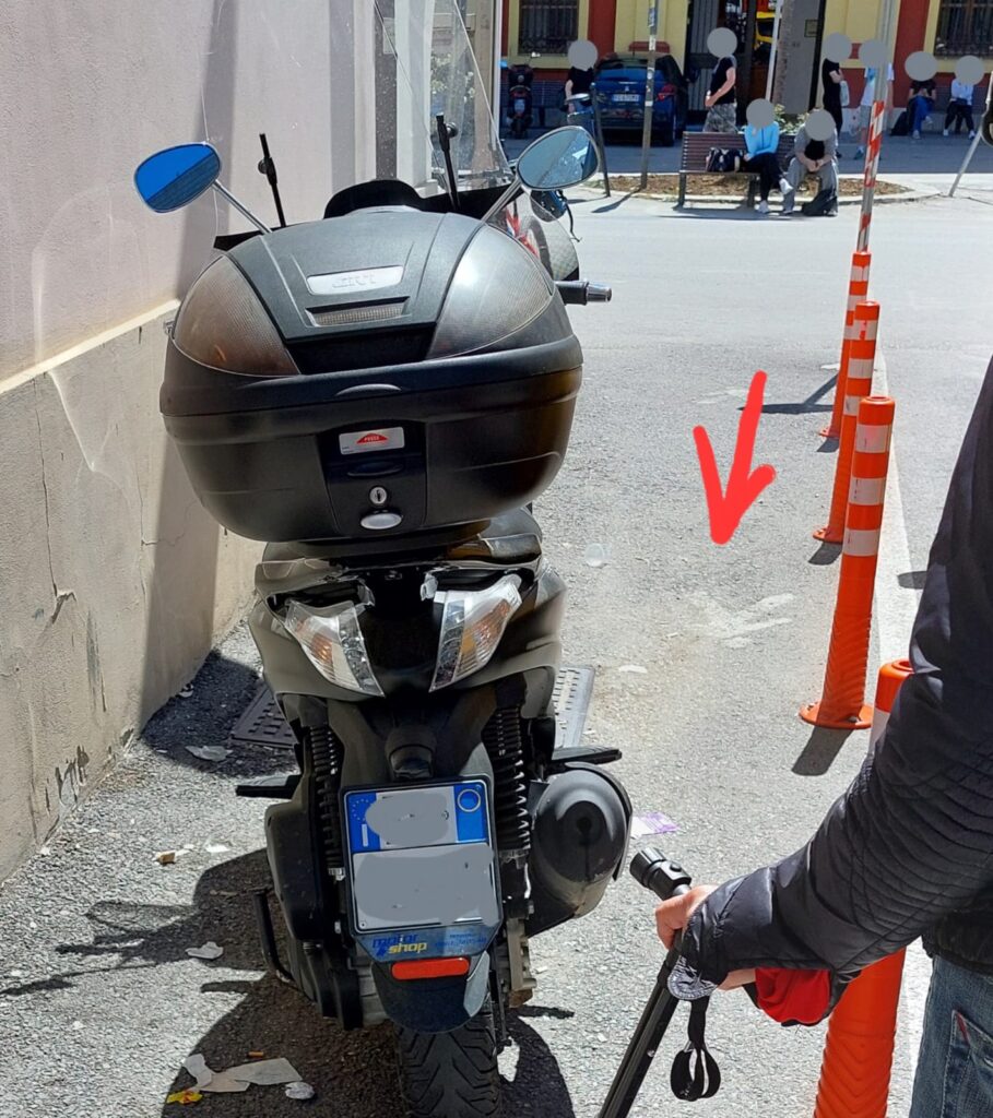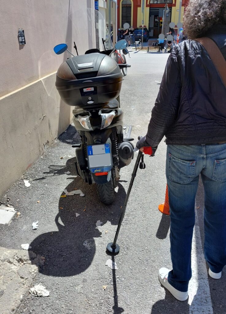 A Teramo in via Pannella uno scooter, parcheggiato nella corsia pedonale, impedisce il passaggio a diversamente abili e pedoni.