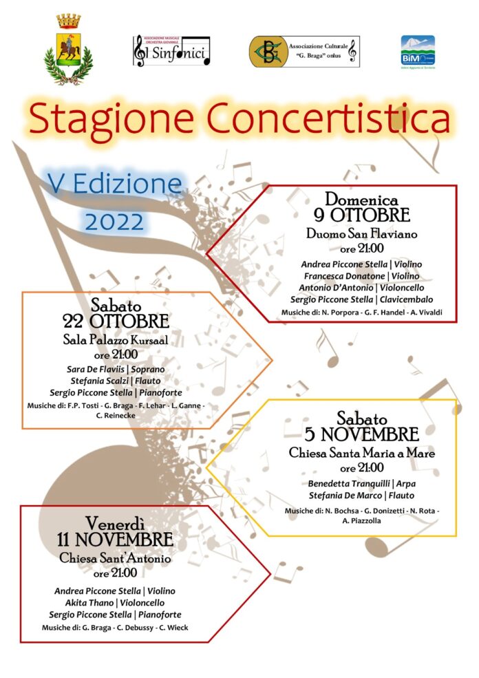 La rassegna, patrocinata dal Comune di Giulianova e organizzata dalle associazioni “I Sinfonici” e “Gaetanto Braga onlus” con il contributo del Bim, propone questa volta musiche di Braga, Tosti, Lehar, Lombardo-Ranzato, Ganne, Reinecke.