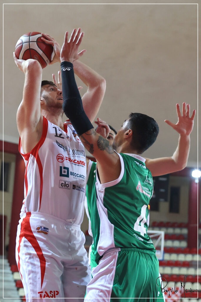 Non c’è stato però scoramento nella Teramo a Spicchi. Tutt’altro. Nella seconda metà dell’incontro la TaSp è comunque rimasta sempre in scia agli avversari, nonostante i pesanti problemi di falli che hanno condizionato non poco le rotazioni e i minutaggi decisi dallo staff tecnico biancorosso. Complice la fisicità della difesa casertana, lo svantaggio è sceso anche a -9 (54-45, 26’) per la formazione di coach Gabrielli, che nel frattempo ha vissuto qualche minuto in apprensione per Arcangelo Guastamacchia, soccorso immediatamente dai sanitari presenti dopo aver subito un forte colpo al petto da un giocatore avversario. Contro tutto e tutti i biancorossi non si sono quindi demoralizzati, arrivati anche a tirare per vincere a fil di sirena dai 6,75 con Alessandro Vigori. La palla però non ha voluto premiare il centro della Teramo a Spicchi, autore di una prova convincente in fase offensiva (17 punti con 7/15 dal campo).