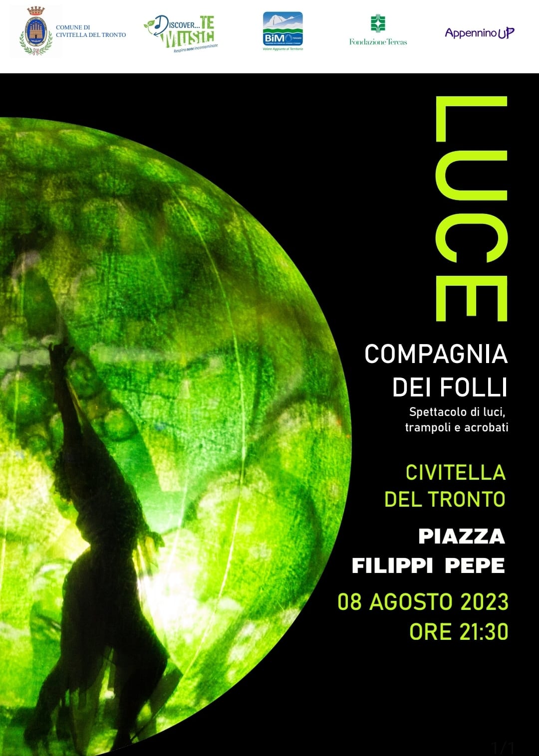 Prosegue con successo il progetto “DiscoverTE Music, Respira note incontaminate”, supportato da Consorzio BIM e Fondazione Tercas per il rilancio delle aree interne del comprensorio attraverso concerti ed eventi live, ad ingresso gratuito. Domani martedì 8 agosto, alle ore 21.30, è la volta di Civitella del Tronto che ospiterà in piazza Filippi Pepe lo spettacolo di luci, trampoli e acrobati “Luce” della Compagnia dei Folli. L’organizzazione dell’evento è curata dal Comune di Civitella e dall’associazione culturale “Appennino Up”.
