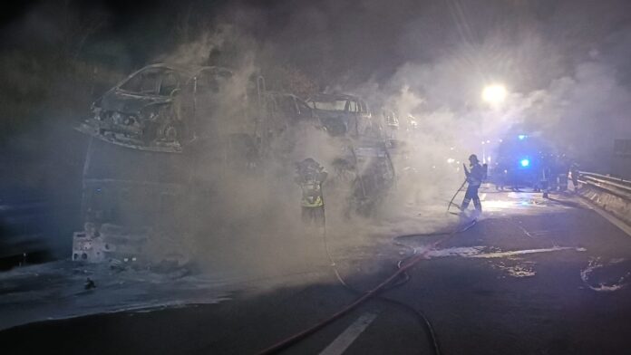 Ieri, intorno alle 22:30, tre squadre dei vigili del fuoco dei Distaccamenti di Roseto degli Abruzzi e Montesilvano e del Comando di Teramo, con l’ausilio di due autobotti del Comando di Pescara e Teramo, sono intervenute al Km 360 dell’Autostrada A14, sulla carreggiata in direzione sud, nel comune di Silvi, a seguito dell’incendio di un autoarticolato adibito al trasporto di autoveicoli. L’autista della bisarca, accortosi della presenza dell’incendio a bordo, ha abbandonato velocemente il mezzo e si è portato in posizione di sicurezza chiamando i soccorsi. Le fiamme hanno avvolto il mezzo pesante e tutte le autovetture trasportate. Il primo intervento di spegnimento è stato effettuato dalle autopompe di Montesilvano e Pescara che hanno raggiunto il punto dell’incendio contromano scortate dalla Polizia autostradale, vista la difficoltà dell’autopompa di Roseto ad avanzare in corsia sud a causa della lunga fila di automezzi fermi in coda. Le operazioni di spegnimento dell’incendio sono state piuttosto complesse. I vigili del fuoco hanno provveduto a mettere in sicurezza l’autoarticolato che è andato completamente distrutto dalle fiamme insieme alle autovetture trasportate. Sull’autostrada, che è stata chiusa al traffico, si sono formate lunghe file di automezzi. Sul posto sono intervenuti anche la Polizia autostradale del VII tronco di Città Sant’Angelo e personale di Autostrade per l’italia per gli adempimenti di propria competenza.