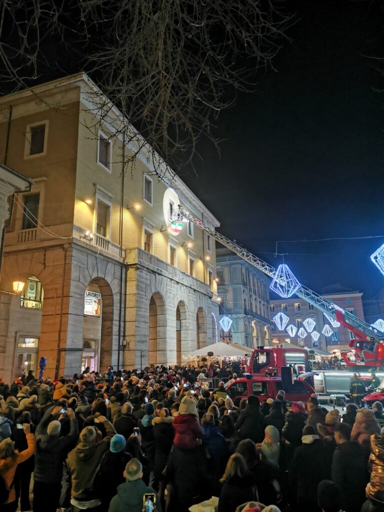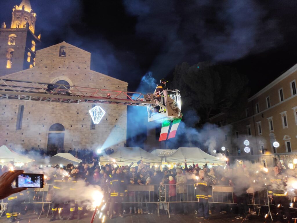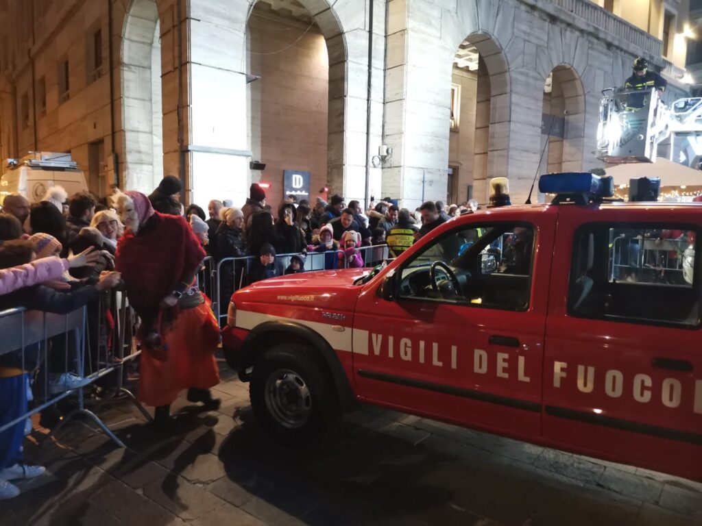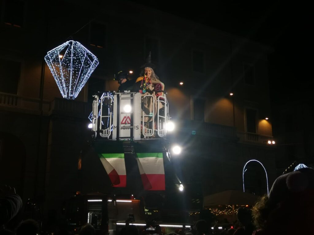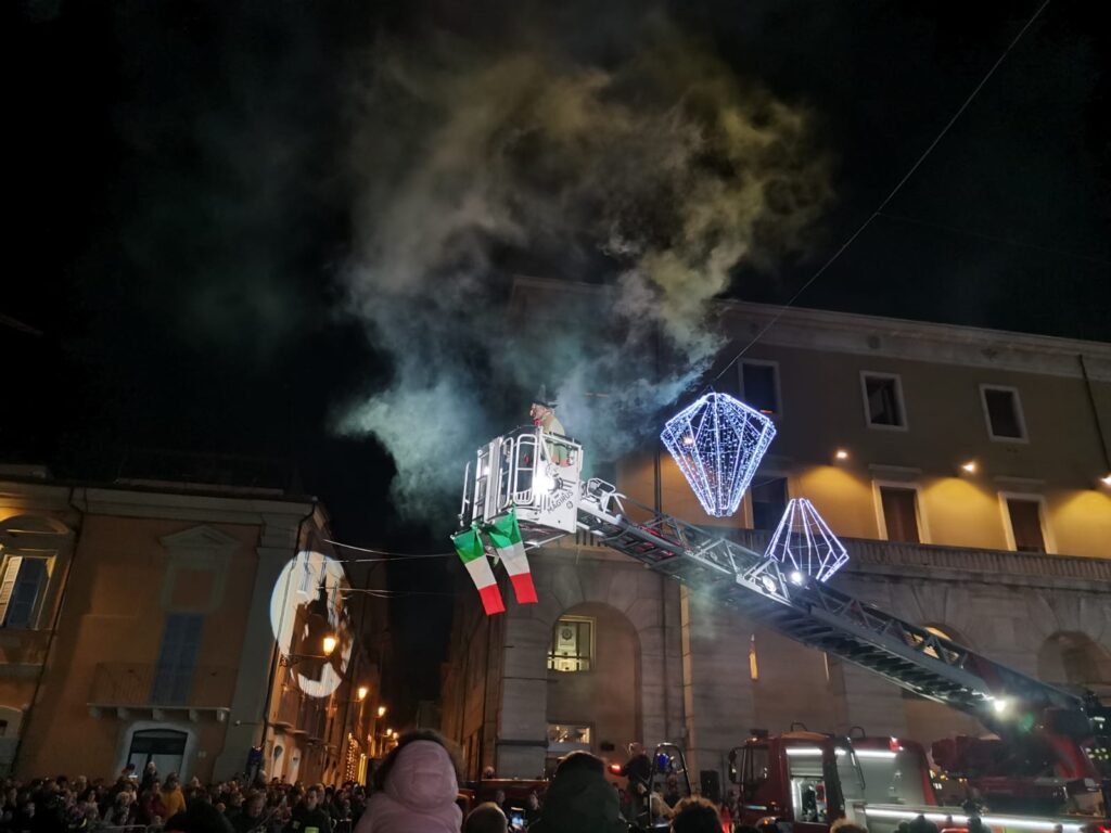 Tanti bimbi in piazza Martiri a Teramo per la Befana dei vigili del fuoco che all’arrivo del buio è comparsa dal palazzo della TEAM, da dove ha iniziato la discesa sul cestello dell’autoscala, raggiungendo la piazza sottostante, gremita di bambini. Le buone condizioni del tempo hanno favorito una grandissima affluenza nella piazza centrale, per quella che è ormai diventata una tradizione teramana del giorno dell’Epifania ormai alla 14esima edizione. Tutti quindi con lo sguardo rivolto verso l’alto per osservare con stupore la discesa nella piazza, concluso in un tripudio di applausi e i sorrisi dei più piccoli che hanno ricevuto in dono tante caramelle. L’evento è stato organizzato dall’Associazione Grisù – Amici dei Vigili del Fuoco e della Sezione di Teramo dell’Associazione Nazionale dei Vigili del Fuoco in collaborazione con il Comando Provinciale dei Vigili del Fuoco di Teramo e con il patrocinio del comune di Teramo.