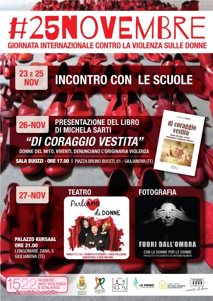 Ad essere coinvolti, innanzitutto, gli studenti delle scuole Superiori e Medie di Giulianova che, nelle giornate di mercoledì e venerdì, incontreranno gli amministratori comunali e gli operatori del Centro La Fenice. Alle 17, in sala Buozzi, l’autrice Michela Sarti presenterà invece il suo libro “Di coraggio vestita”. Chiudono il calendario delle iniziative, domenica 27 al Kursaal, il recital “Parliamo di donne” e la mostra fotografica “Fuori dall’ombra”.