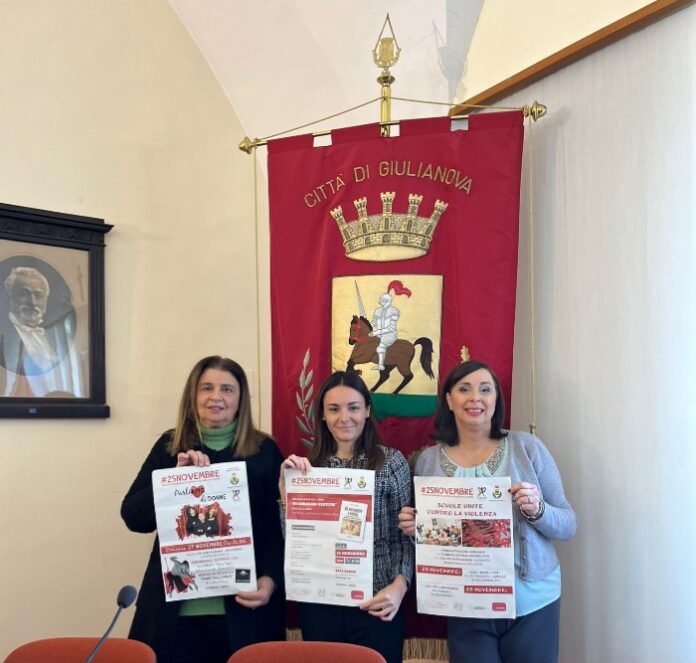 La ricorrenza del 25 novembre, Giornata internazionale per l’eliminazione della violenza sulle donne, non trova impreparata la Commissione Pari Opportunità del Comune di Giulianova. L’organismo, presieduto da Marilena Andreani, ha infatti messo a punto una serie di iniziative che, tra mercoledì 23 e domenica prossimi 27 novembre, accenderà i riflettori sul nodo, mai sciolto, della violenza sulle donne. Il programma è stato presentato questa mattina in sala consiliare dal Vice Sindaco Lidia Albani, dalla presidente della Commissione Pari Opportunità Marilena Andreani e dalla componente della stessa Cpo Cinzia Mattiucci.
