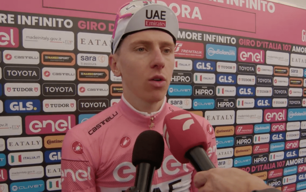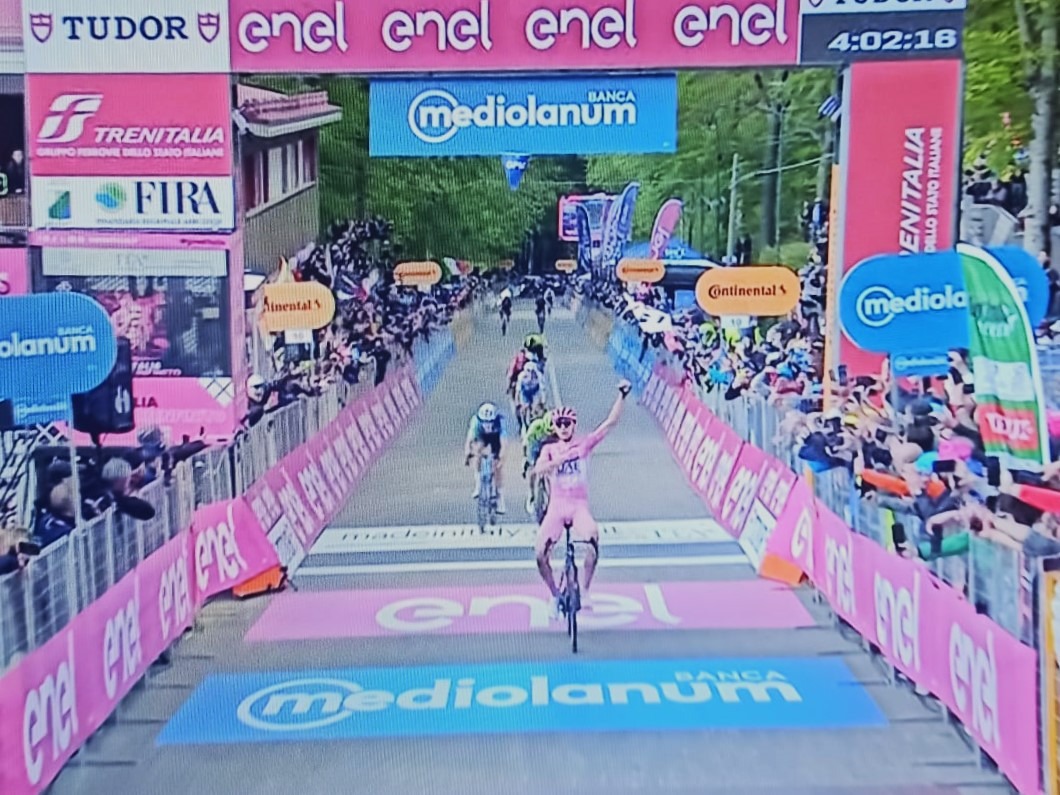 La maglia rosa conferma la sua superiorità e si aggiudica anche la tappa Spoleto – Prati di Tivo. Per lui è la decima vittoria stagionale ottenuta dopo aver controllato la corsa e allungato nel finale, quanto è bastato per tagliare per primo il traguardo. (In evidenza immagine fonte RAI)