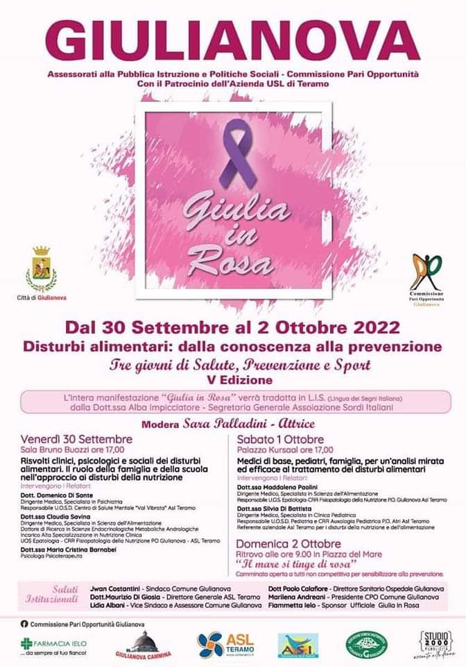 Si terrà dal 30 settembre al 2 ottobre, la consueta tre giorni dedicata alla prevenzione, anche quest’anno organizzata dalla Commissione Pari Opportunità del Comune di Giulianova. “Giulia in Rosa”, dunque, torna e, nel 2022, lo fa per approfondire il complesso tema dei disturbi alimentari.