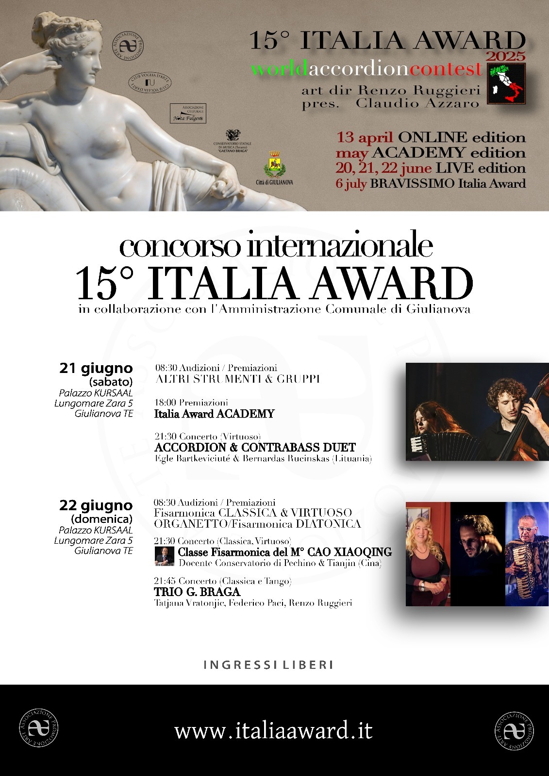 “L’evento, nato per celebrare la grande famiglia delle fisarmoniche, ha progressivamente ampliato i propri orizzonti, accogliendo tutti gli strumenti e tutti i generi musicali all’interno del concorso”, ha detto il direttore artistico Renzo Ruggieri,“Grazie al sostegno dell’Amministrazione comunale di Giulianova e di sponsor privati, il festival propone anche quest’anno un ricco calendario articolato in quattro appuntamenti distribuiti nell’arco dell’anno: