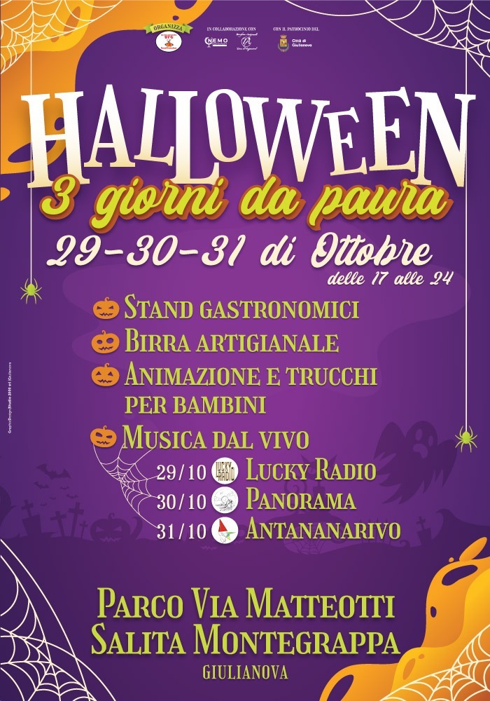 A partire dalle 17, il truccabimbi e un’ animazione a tema distrarrà i più piccoli. Stand gastronomici proporranno vino e birra artigianale di produttori locali, arrosticini, panini con la salsiccia, patatine. Dalle 22, il programma sarà rivolto ai grandi. Stesso menù a disposizione e in più musica dal vivo con i Lucky Radio (sabato 29 ottobre), Panorama ( domenica 30), Antananavivo ( lunedì 31).