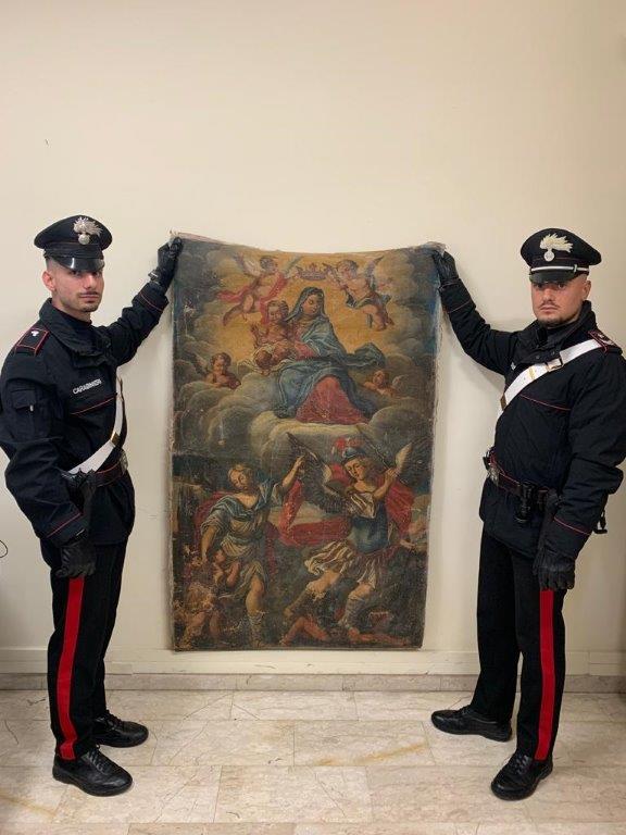 Martinsicuro (TE) i Carabinieri recuperano un antico dipinto rubato in epoca imprecisata e comunque nel corrente anno dalla chiesa di San Michele Arcangelo di Rocca Santa Maria (TE) località Riano. Si tratta di una pala d’Altare delle dimensioni di cm. 168X103, databile intorno all’ultima metà del 1700 di autore ignoto raffigurante “Madonna con Bambino assisa in un trono di nuvoleincoronata da Angeli, San Michele Arcangelo e Angelo custode ”.