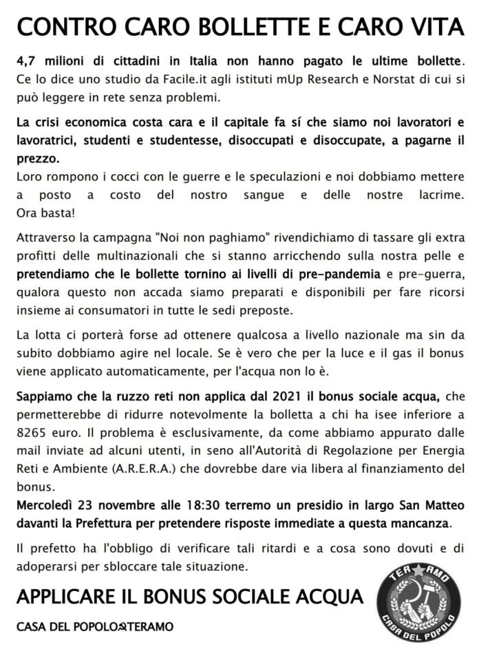 Quindi saremo domani, mercoledì 23 novembre, alle ore 18:30 in Largo San Matteo, sotto alla Prefettura di Teramo, per pretendere risposte immediate a questa mancanza.