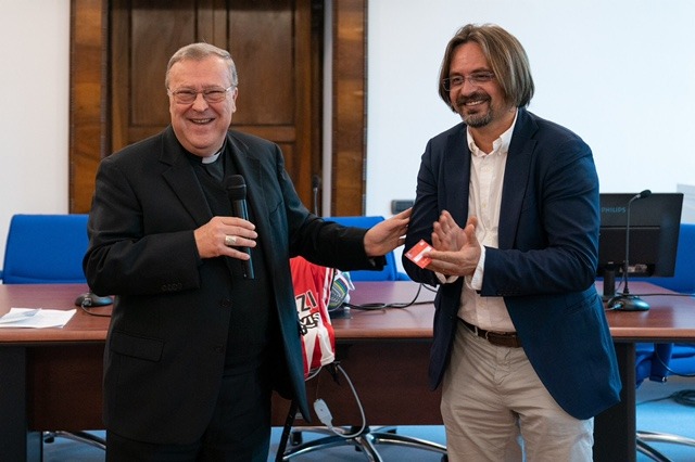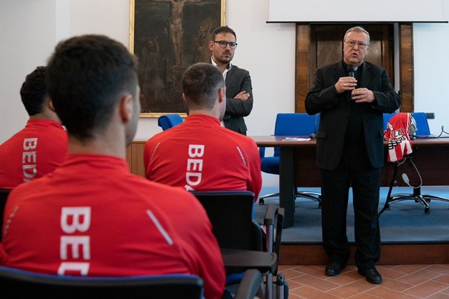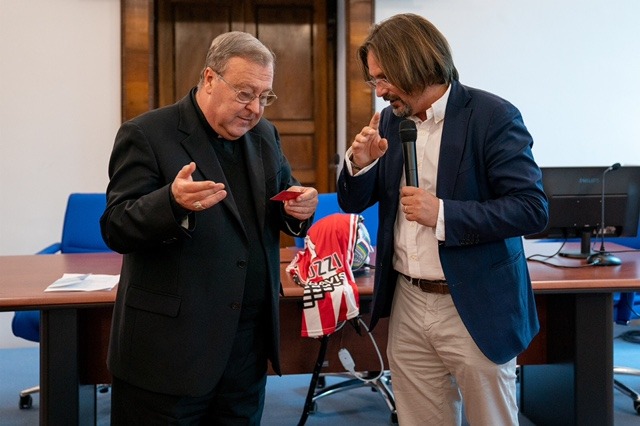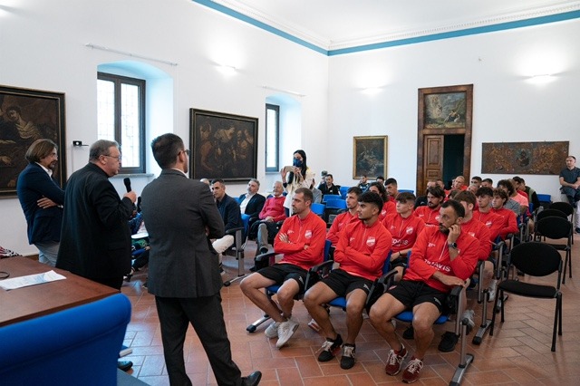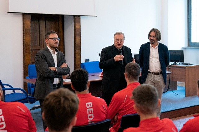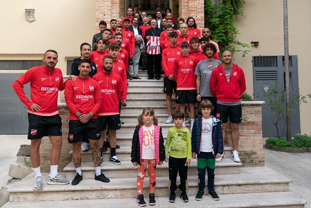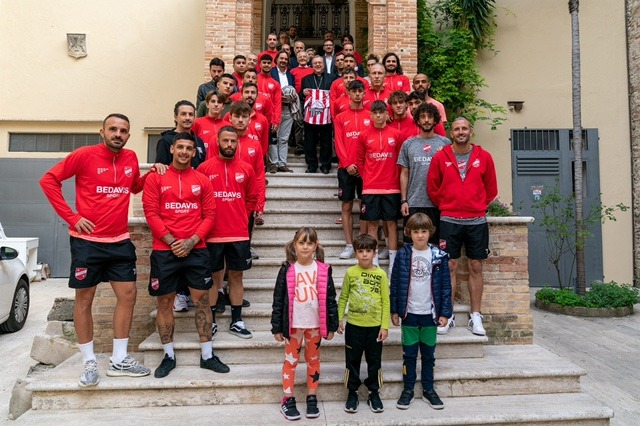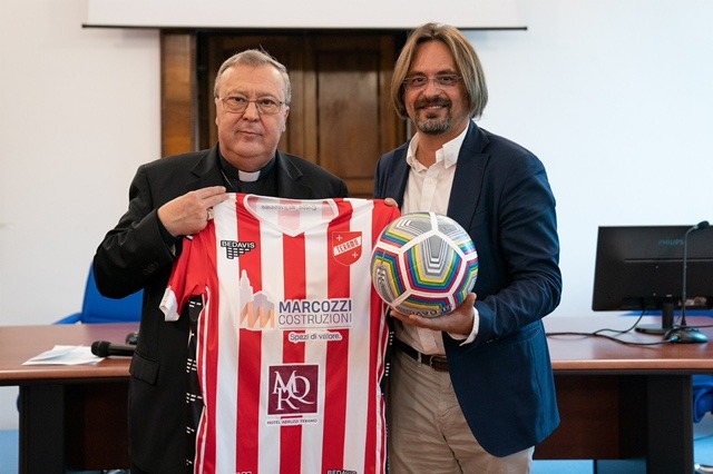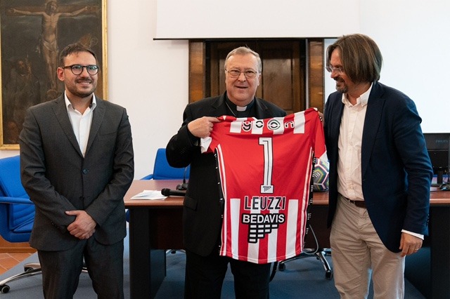 È stato un incontro emozionante e ricco di significato, quello di oggi pomeriggio nel palazzo vescovile tra il vescovo della diocesi Teramo- Atri Lorenzo Leuzzi e la squadra del Città di Teramo accompagnata dallo staff tecnico e societario. I ragazzi in divisa biancorossa sono stati presentati al vescovo dal direttore dell’Ufficio diocesano per lo sport Angelo De Marcellis e, attraverso il capitano Ivan Speranza, gli hanno donato un pallone da calcio. Il presidente Eddy Rastelli ha donato a Leuzzi la maglia ufficiale della squadra personalizzata e un pass per assistere a tutte le partite casalinghe. È seguito, poi, un momento di raccoglimento e preghiera e la benedizione .