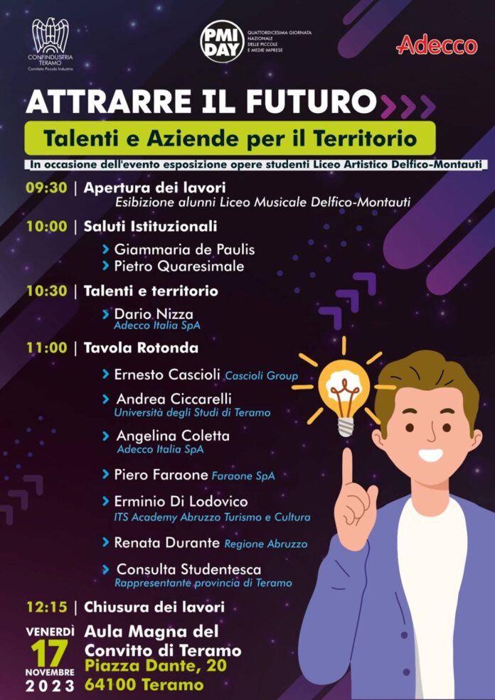 Il Comitato Piccola Industria di Confindustria Teramo anche quest’anno ha aderito al PMI DAY – uno degli eventi più significativi per diffondere la conoscenza della realtà produttiva delle imprese e il loro impegno quotidiano a favore della crescita. Libertà e valorizzazione dei Talenti, il tema centrale. Se ne parlerà domani dalle 9,30 nell’aula magna del Convitto in un incontro con gli studenti dell’ultimo anno di alcune Scuole teramane.