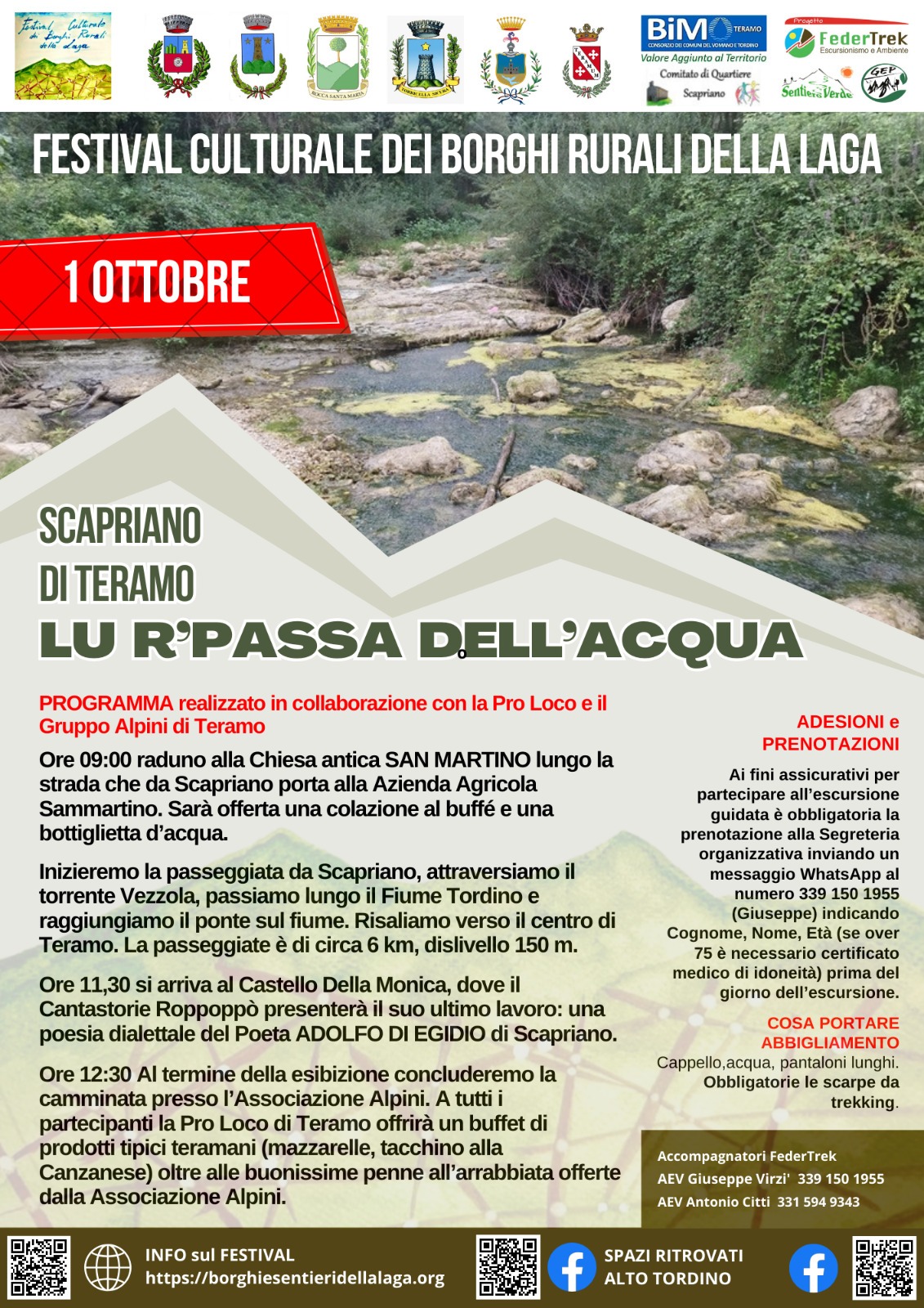 Domenica prossima nell’ambito del festival culturale dei borghi della Laga, si terrà la passeggiata denominata “Lu r’passà dell’acqua”, organizzata dalla Pro Loco Teramo e dal Gruppo Alpini.