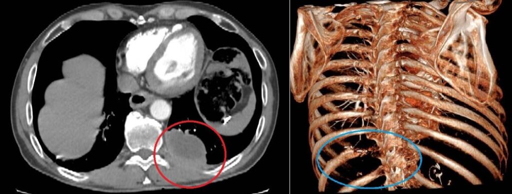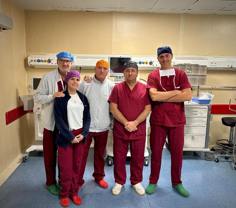 Si tratta di un uomo di 67 anni, residente nella provincia dell’Aquila, colpito da un voluminoso tumore polmonare sinistro che aveva infiltrato strutture ossee e muscolari della parete toracica fino a raggiungere la cute. Dopo un percorso di chemioterapia e immunoterapia neoadiuvante, effettuato per ridurre la massa e rendere possibile la chirurgia, il paziente è stato sottoposto a una complessa procedura operatoria. Il trattamento chirurgico ha previsto la rimozione del tumore mediante lobectomia polmonare inferiore sinistra, la demolizione della porzione di parete toracica infiltrata, con asportazione delle strutture coinvolte (coste, muscoli e cute), e la successiva ricostruzione parietale attraverso il posizionamento di una protesi biologica ADM (Acellular Dermal Matrix) nella sede priva delle costole. A completamento della riparazione è stato effettuato il trasferimento di un lembo muscolo-cutaneo destro, utilizzando il muscolo gran dorsale controlaterale, così da ricostituire l’integrità anatomica e funzionale della parete toracica.