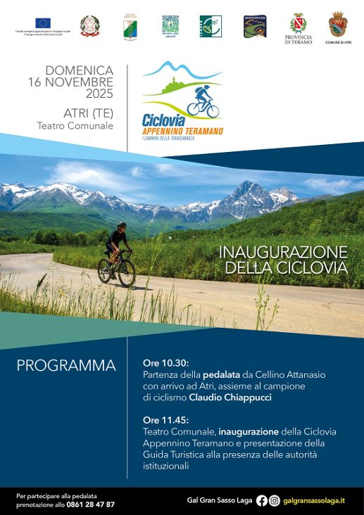 Sarà inaugurata domenica 16 novembre al Teatro Comunale di Atri la Ciclovia dell’Appennino Teramano – I Cammini della Transumanza, un innovativo itinerario cicloturistico ad anello di 346 chilometri promosso dal GAL Gran Sasso Laga. Il percorso, articolato in 10 tappe, attraversa antichi tratturi e sentieri della transumanza, connettendo borghi e paesaggi del territorio teramano in un progetto di turismo lento e sostenibile.