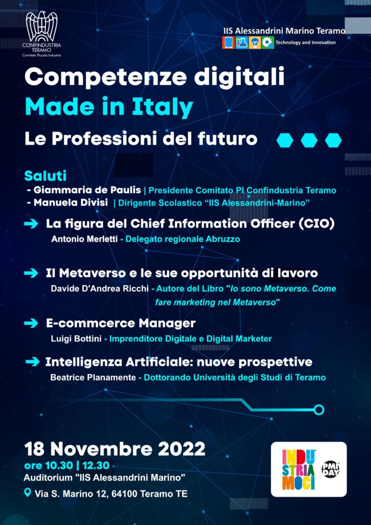 “Crediamo nell’importanza dell’incontro tra la scuola e le imprese per costruire un futuro ai giovani più solido e mirato, soprattutto tenendo conto delle opportunità che il digitale offre.” – dichiara il Presidente del Comitato P.I. di Confindustria Teramo, Giammaria de Paulis – “Anche il PMI DAY è un’ulteriore occasione di incontro e conoscenza per tutti, Imprenditori, Studenti e Docenti. Un ‘occasione che permette di conoscere storie imprenditoriali, di condividere il valori come il coraggio, la capacità di non arrendersi, di mirare sempre con passione ed entusiasmo a nuovi obiettivi, di guardare con speranza e ottimismo al futuro. Stiamo attraversando un momento nuovo e delicato, ma siamo certi che grazie alla “ bellezza del saper fare italiano” e del “fare insieme”, anche nell’ambito delle Competenze Digitali si potranno vincere le sfide e creare tante nuove opportunità”.