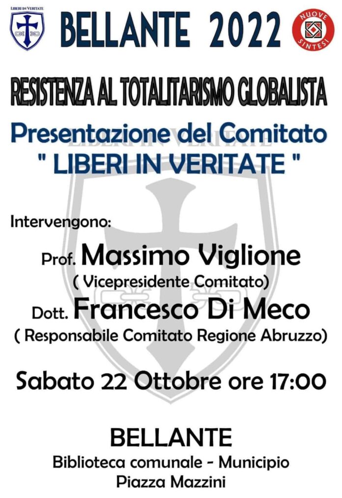 L’Ass.ne culturale Nuove Sintesi – in collaborazione col Comitato “Liberi in Veritate” – invita alla conferenza “RESISTENZA AL TOTALITARISMO GLOBALISTA”; nel corso dell’incontro verrà presentato il Comitato “LIBERI IN VERITATE”.