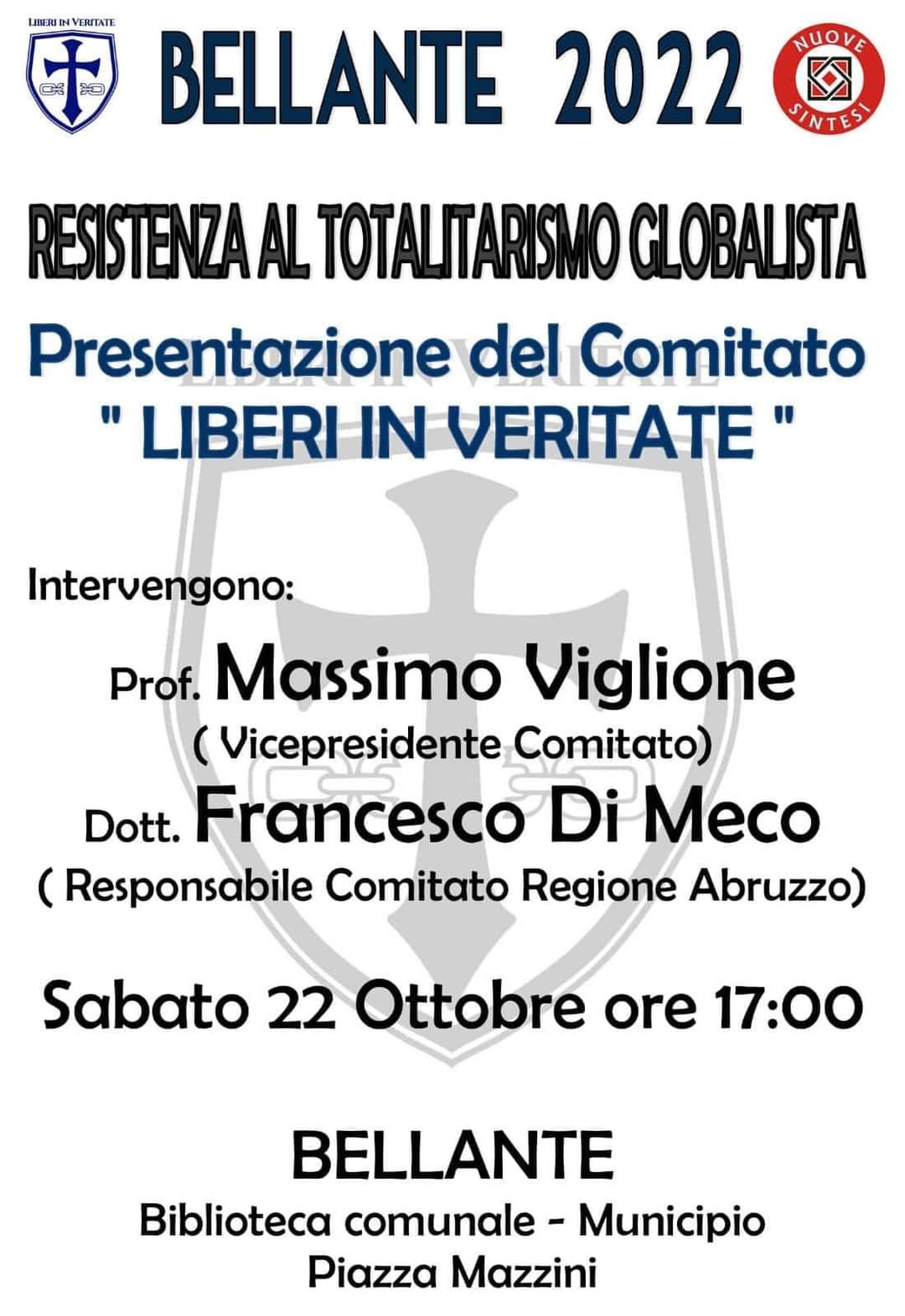 Interverranno il Prof. Massimo Viglione (Storico, Saggista, Vicepresidente del Comitato “Liberi in Veritate”), e il Dott. Francesco Di Meco (Responsabile Comitato “Liberi in Veritate” Regione Abruzzo).