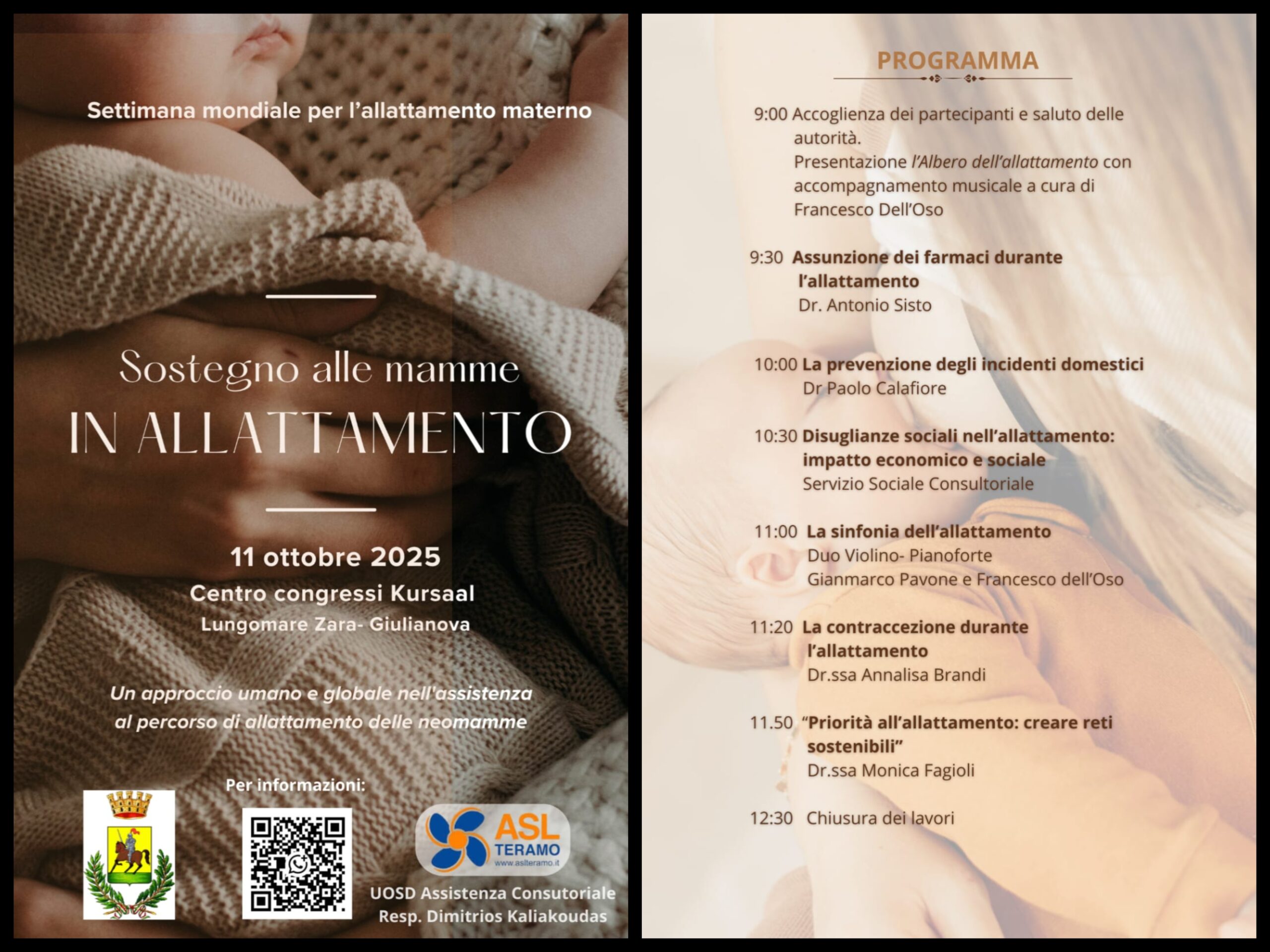 In occasione della Settimana Mondiale dell’Allattamento Materno (1-7 ottobre 2025), i consultori familiari della ASL di Teramo organizzano una serie di open day dedicati a mamme, papà e famiglie, con l’obiettivo di promuovere la cultura dell’allattamento al seno, rafforzare il sostegno alla genitorialità e valorizzare la salute materno-infantile.
