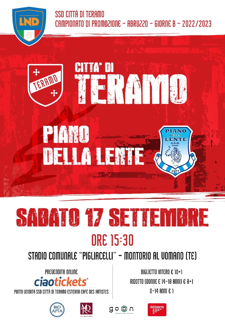 E’ stato allestito un punto vendita sotto ai portici di piazza Martiri all’esterno del Caffè des Artistes per acquistare i biglietti della prima partita del campionato di promozione del Città di Teramo contro il Piano della Lenta e sottoscrivere gli abbonamenti oggi con orario mattina 10,30- 13, pomeriggio 15- 20. Domani mattina il punto vendita sarà aperto dalle 9 alle 12,30, dopo si potranno acquistare i biglietti nello stadio “Pigliacelli” di Montorio dalle 13 alle 15,30. Inoltre è possibile anche acquistarli in un punto autorizzato ciaotickets ( invio allegato con la lista) o sul sito www.ciaotickets.com