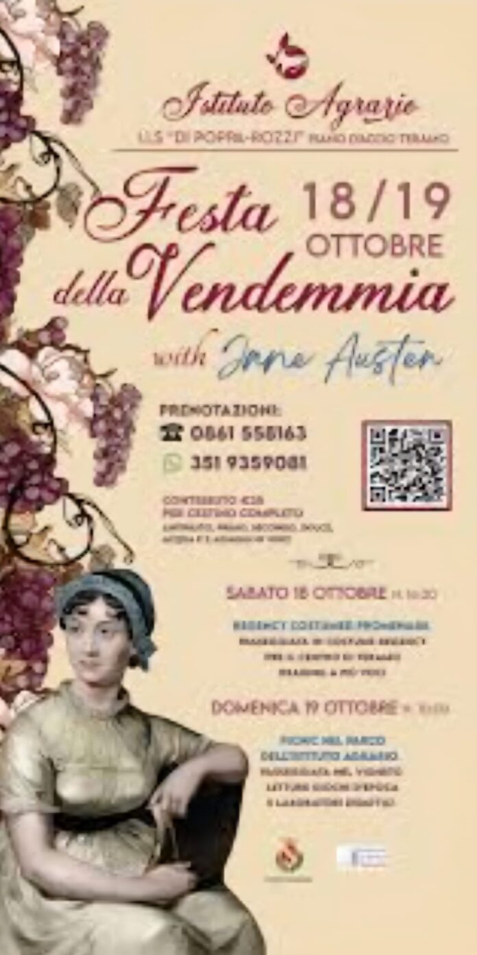Teramo si prepara a vivere un weekend davvero speciale: il 18 e 19 ottobre la città accoglierà la “Festa della Vendemmia – Un weekend con Jane Austen”, organizzata dall’Istituto Agrario “Di Poppa – Rozzi”, un evento che unisce la tradizione agricola del territorio al fascino senza tempo della grande scrittrice inglese.