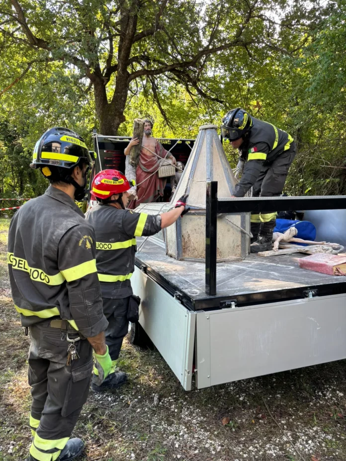Le opere sono state caricate su un mezzo predisposto per il trasporto e trasferite in una chiesa del territorio, dove saranno custodite temporaneamente in attesa di futuri restauri e della loro ricollocazione definitiva.