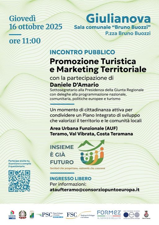 Prosegue con un nuovo importante appuntamento il percorso partecipativo finalizzato all’elaborazione della strategia territoriale dell’Area Urbana Funzionale (AUF) Teramo – Val Vibrata – Costa Teramana. I 25 Comuni che compongono l’AUF, con Teramo capofila, sono destinatari di quasi 8 milioni di euro provenienti dal Programma Regionale Abruzzo FESR 2021-2027, fondi destinati a progetti integrati volti allo sviluppo economico e sociale del territorio.